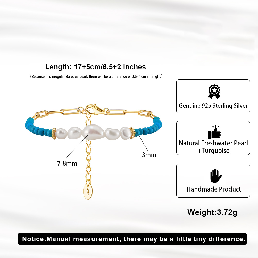 925 Sterling Silver Bracelet with Natural Freshwater Pearl& Turquoise/ 14K Gold Plated